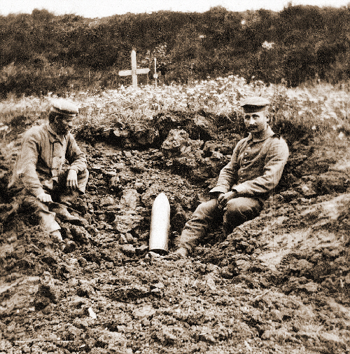 When one hears the sifflement [whistling] the danger has already passed. The shells which burst immediately overhead and rattle on the roof of our bombproof dugout come unheralded. Sometimes they come singly, sometimes in rapid salvos of two or three or four. Shrapnel's explosive report is followed by the whiz of the flying balls. Contact shells or marmites explode more impressively, so that the earth trembles. Shrapnel shatters trees and snaps good sized trunks as if they were twigs; contact shells dig holes eight or ten feet across all over fields. . .