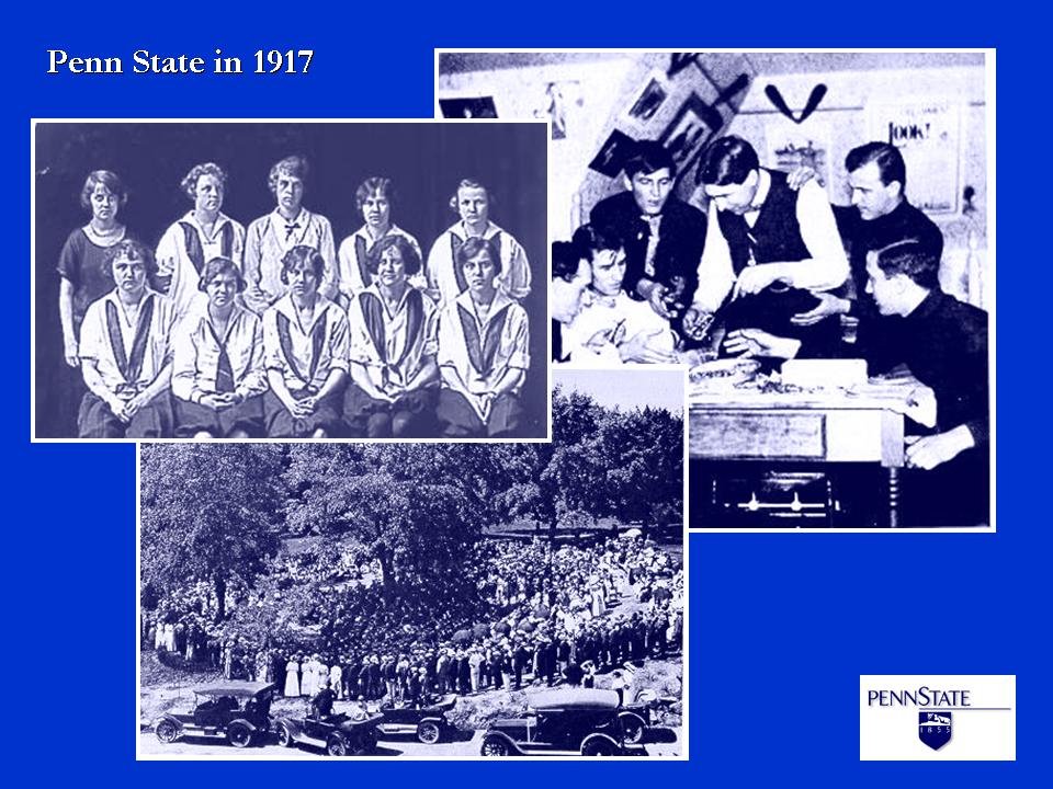 At the Washington meeting, college and university officials also promised to cooperate fully with the federal government and the quasi-military agencies that had been created to coordinate mobilization for war. The implications of this pledge were not to be realized for many months. In the meantime, Penn State geared up to meet the emergency. The 1917 summer session for teachers began on schedule with a record enrollment of 1,104. Except for compulsory military drills for men and a course in first aid and nursing for women, the session resembled those of past summers.