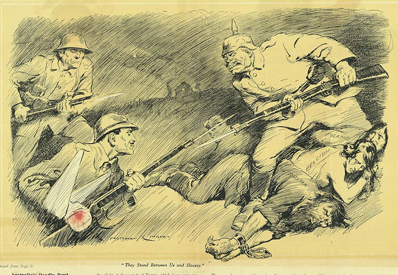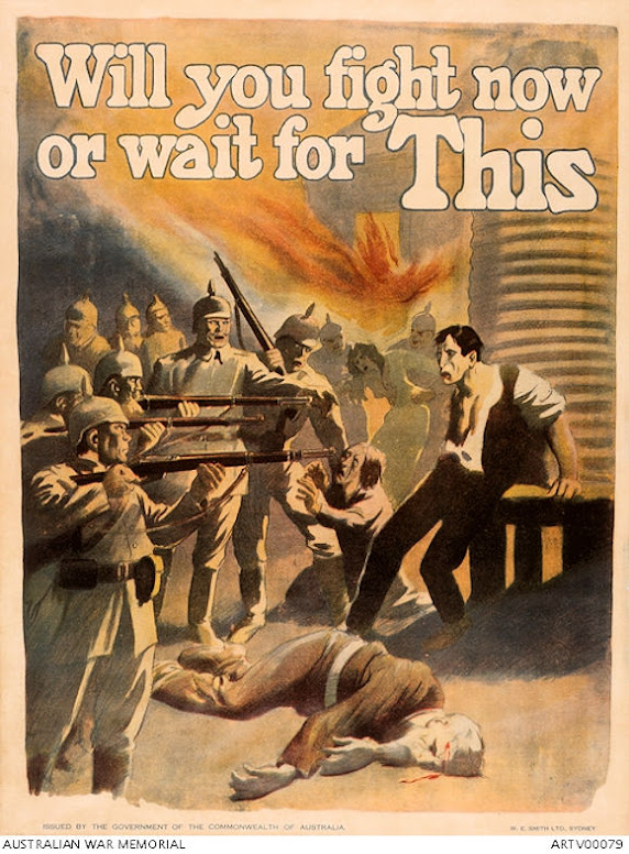 Norman Lindsay was born in Victoria, Australia, on 23 February 1879. After working as a sports illustrator in Melbourne he joined the Sydney Bulletin in 1901 and eventually became the newspaper's chief cartoonist. A painter, sculptor, and book illustrator, he produced a vast amount over seven decades of productivity. Lindsay was asked on the outbreak of the First World War to produce a series of propaganda posters for the Allies. During the First World War he produced a large body of recruiting posters and cartoons. Many of them were jingoistic and some, including some pro-conscription drawings, were highly controversial. He used an "ogre" figure in a number of his piece to represent Germany. Played by Sam Neill, Lindsay was portrayed as a unconventional libertine in the 1994 film Sirens He is today recognized as one of Australia's greatest artists. Lindsay died on 21s November 1969. I've sorted the images below into two self-explanatory groups. All are representative of Lindsay's war work.
