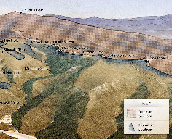 Quinn's Post, named after Major Hugh Quinn, 15th Battalion (Queensland) AIF, was one of the most dangerous places at Anzac. "Men passing the fork in Monash Valley," wrote Charles Bean, "used to glance at the place (as one of them said) as a man looks at a haunted house." Quinn's was positioned on the northern edge of the front line along Second Ridge, and beyond was Deadman's Ridge, from which the enemy could fire into the side of the post. Other Turkish trenches lay opposite, and the Turks had only to advance a few meters, capture Quinn's, and the whole Anzac area could be lost.