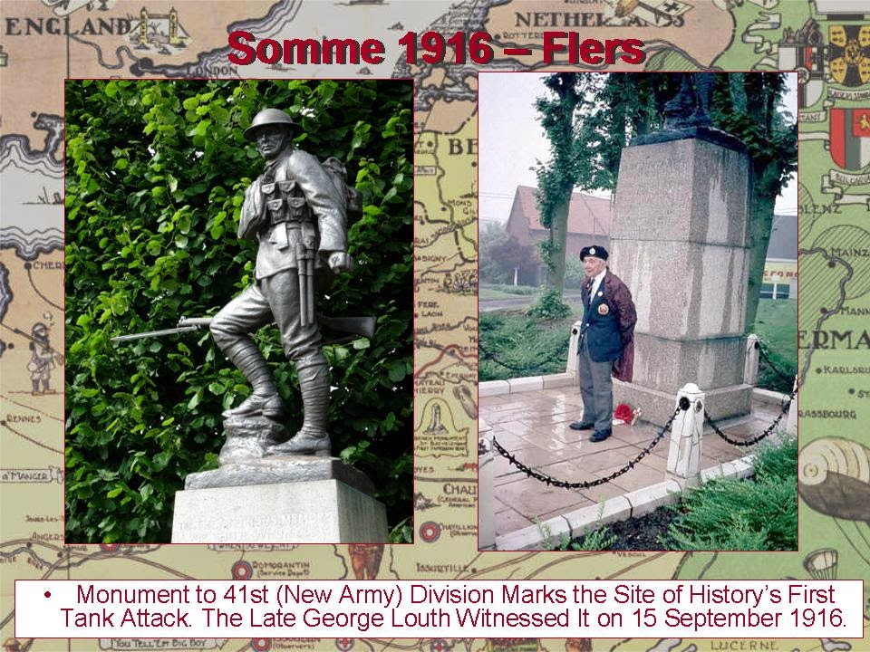 In mid-September 1916 in an operation known as the Battle of Flers-Courcelette, the 41st Division along with the New Zealand Division, stormed and captured the farm village of Flers supported by the first tanks ever committed to battle. There is little recognition of the tank action at Flers, the main Tank Memorial is located on the Albert-Bapaume Road where they were initially assembled. However, Flers does have the most photogenic of all division monuments on the Western Front, with the British Tommy statue in the village center.