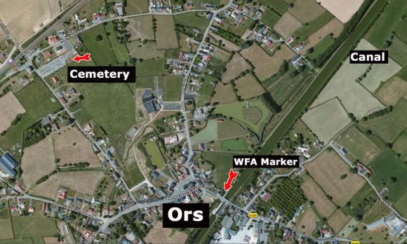 Owen’s time at Craiglockhart—one of the most famous hospitals used to treat victims of shell shock—coincided with that of his great friend and fellow poet, Siegfried Sassoon, who became a major influence on his work. After their treatment, both men returned to active service in France, though only Sassoon would survive the war. Owen came close, but on 4 November 1918, he was shot by a German machine gunner during an unsuccessful British attempt to bridge the Sambre Canal, near the French village of Ors. In his hometown of Shrewsbury, near the Welsh border, his mother did not receive the telegraphed news of her son’s death until after the fighting had ended. Because of his prominence as war poet, Own is well commemorated at the site of his death with a plaque dedicated by the Western Front Association (WFA) and is buried close by at the communal cemetery. Regular contributor Steve Miller has made the pilgrimage to the site and has provided the set of photos below.
