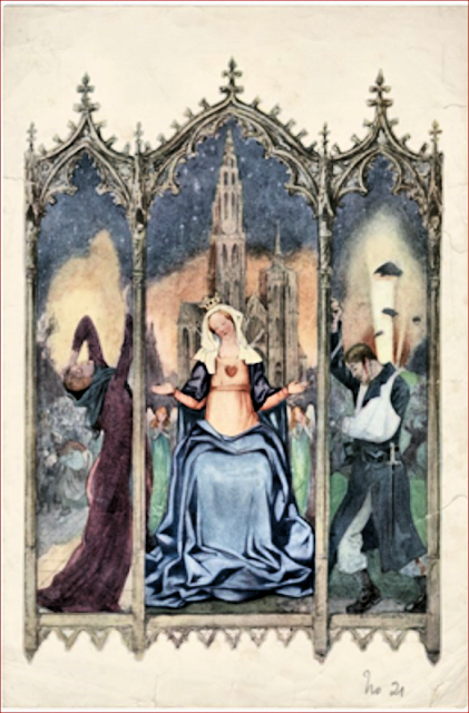An altar piece design with wounded virgin, and Antwerp being destroyed in background. "Here I and sorrows sit. This is my throne, bid Kings come worship it." Such seems to be an appropriate legend for Raemaekers's beautiful triptych which he has entitled "Our Lady of Antwerp." Full of compassion and sympathy for all the sufferings of her people, she sits with the cathedral outlined behind her, her heart pierced with many agonies. On the left is one of the many widows who have lost their all in this war. On the right is a soldier stricken to death, who has done his utmost service for his country and brings the record of his gallantry to the feet of Our Lady of Antwerp.